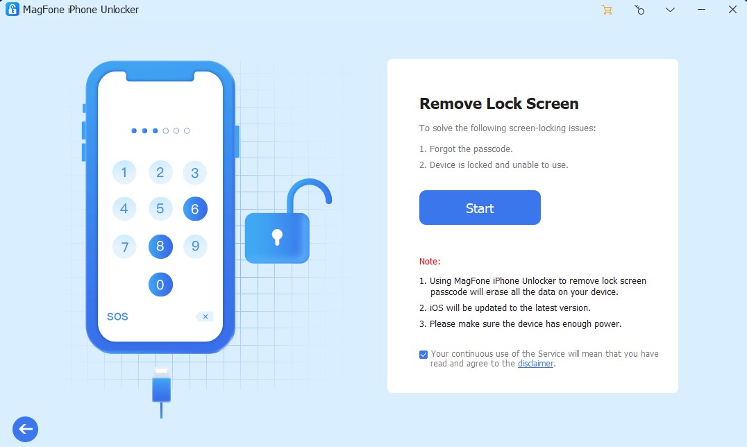 Download and install the MagFone iPhone Unlocker application on your computer. Select the Unlock iOS Screen option, and then click the Start button.