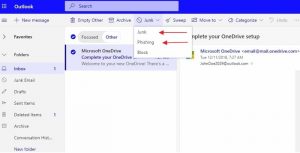 4. Then select Not junk and choose Phishing to mark the message as phishing and report the sender.
