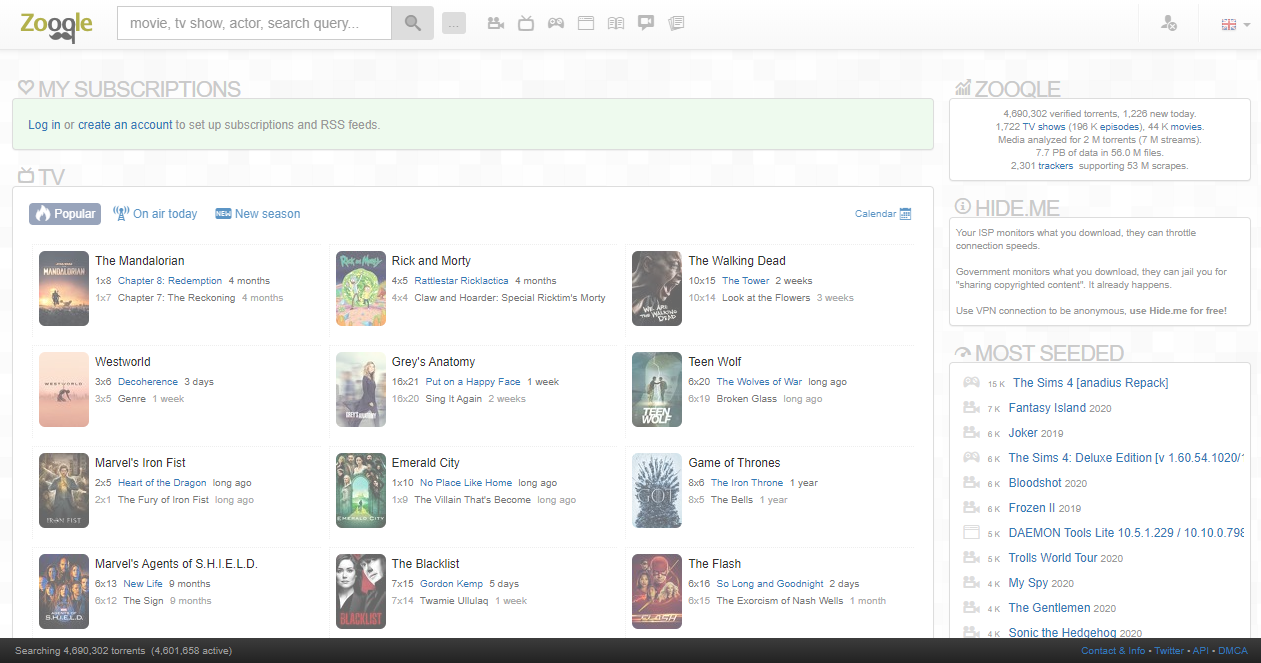 Zooqle is one of the largest torrent sites supported by more than 3.5 M of verified torrents and 2200 trackers. Quick all you can get from this place. All you need to have on your PC is a BitTorrent client, like uTorrent.