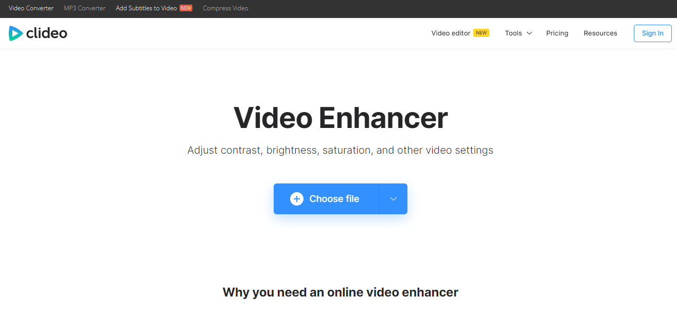 Clideo Video Enhancer Online is a feature-rich tool that offers users various image, audio, and video editing tools. The platform’s Adjust Video tool is designed to correct video colors, improve video quality, and enhance visual appeal. Users can adjust brightness, contrast, saturation, add vignette, and fade to videos with ease.