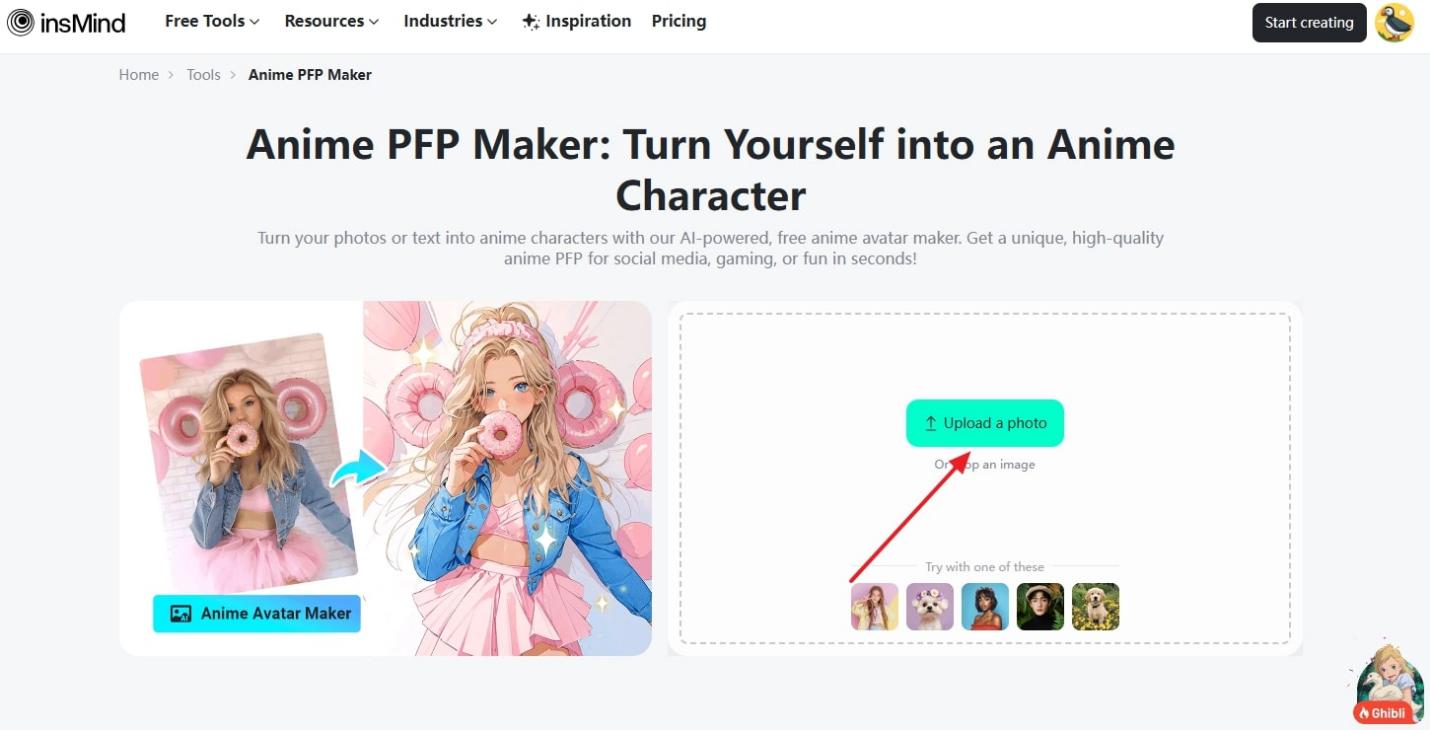 Go to insMind’s Anime PFP Maker and upload the picture you want to convert by clicking the “Upload a Photo” button.