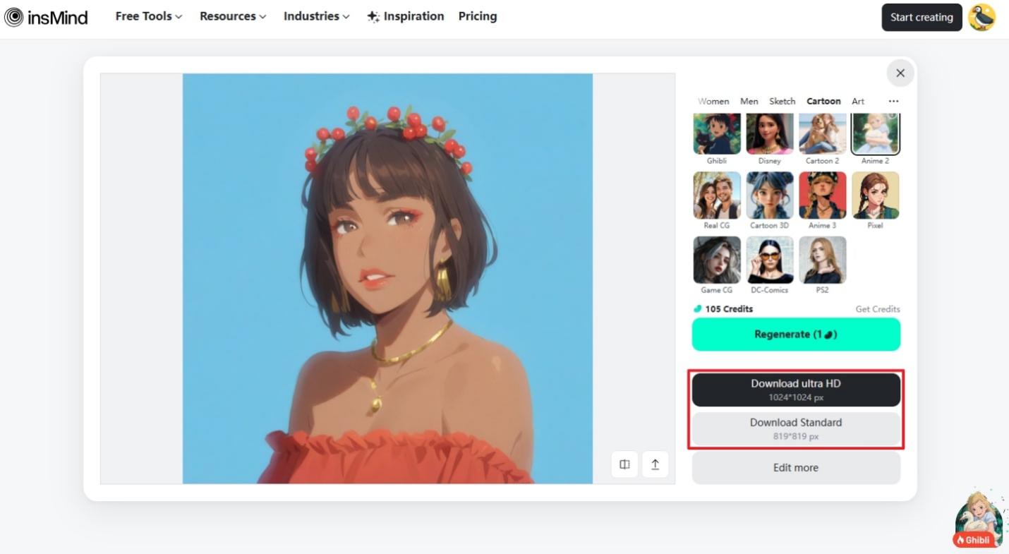 As insMind has many AI p1hoto editing tools to offer, Anime PFP Maker has become quite popular with the growing popularity of Avatars. It offers you all kinds of anime styles under the Cartoon category as Ghibli, Anime 2, and Anime 3, along with other cartoon styles like Real CG, DC-Comics, etc. With its reupload feature, you can change the picture in real-time without starting over the whole process.