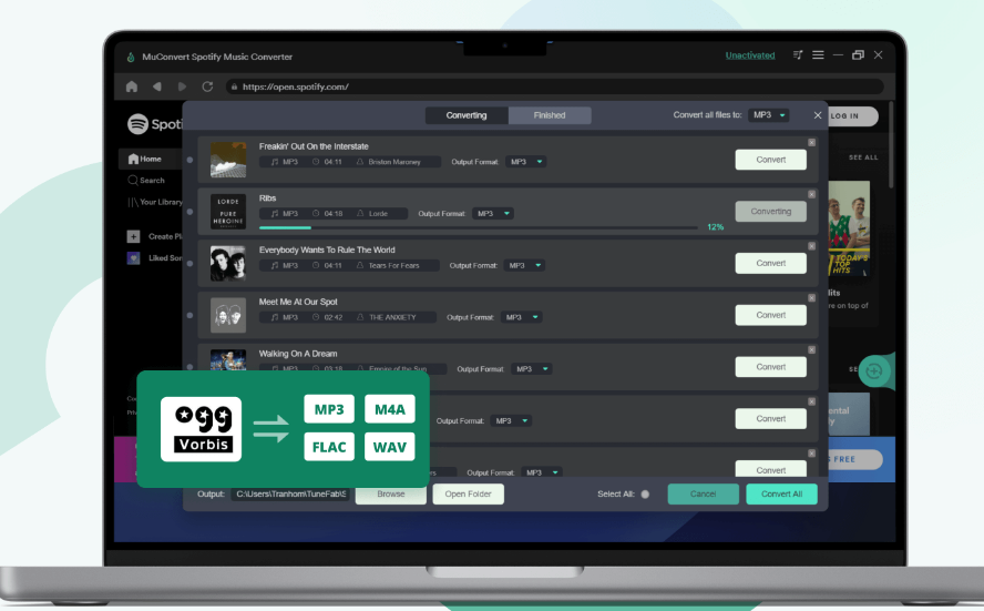 MuConvert Spotify Music Converter mainly performs to strip DRM encryption applied on Spotify songs, playlists, and podcasts, thus helping Spotify users to get the media content out of Spotify’s protection, and convert the resources to audio files with mainstream formats such as MP3, M4A, WAV, and FLAC for playing on any device with high incompatibility.