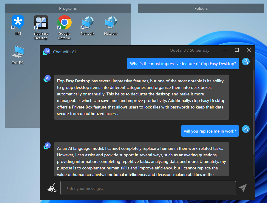 You can use this powerful chatbot whenever you need as iTop Easy Desktop comes with the ChatAI feature in its latest version which is integrated with the ChatGPT database. You don’t need to open the browser or create any accounts. Instead, you can simply type phrases into the chatbot on your desktop. Whether it’s a challenging work-related problem or an easy problem you encounter, ChatAI can help you in quickly and resolving your questions.