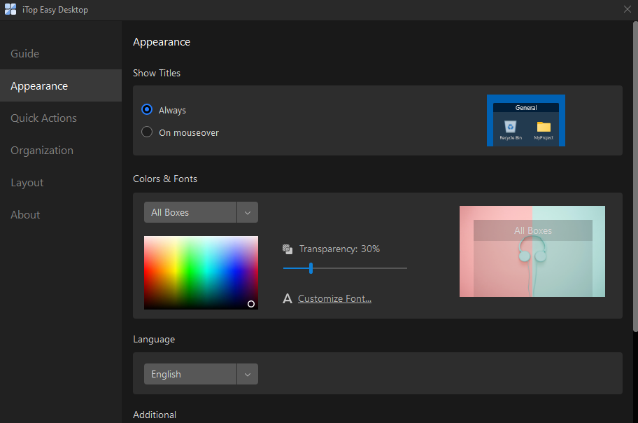 Using iTop Easy Desktop’s personalization settings, you may alter the desk boxes’ backgrounds and transparency. Additionally, you can personalize the text font and tags according to your needs.