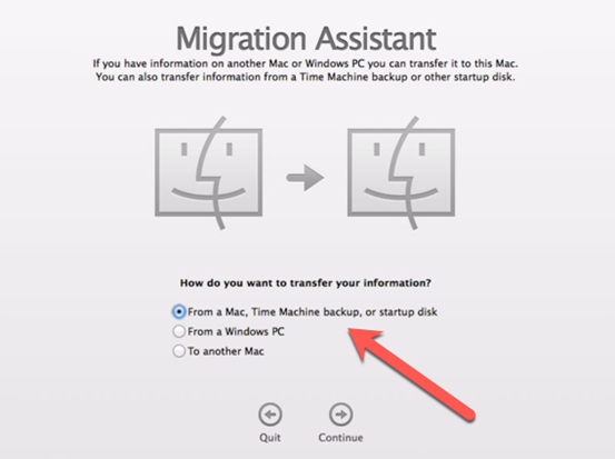 - Once Mac finishes the reinstallation process, you’ll find the Migration Assistant window. Choose Transfer from a Time Machine Backup, then click Continue.