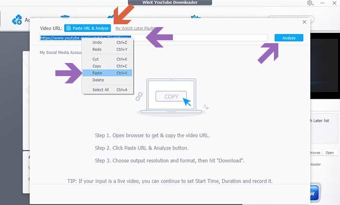 Paste the URL of the video you want to download into the application and click “Analyze” button.