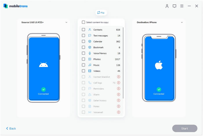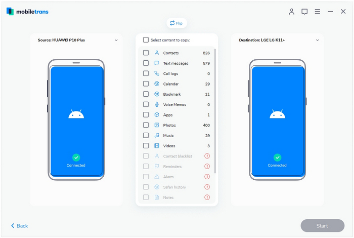 The primary feature of MobiTrans is to transfer data from one device to another irrespective of what type of device you want to transfer the data to. You can transfer data from Android to iOS/Android/Windows Phone and Vice versa.