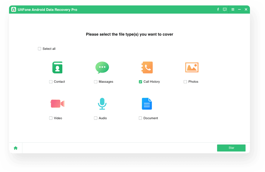 – Choose the types of files you want to recover (messages, contacts, photos, etc.). Then, hit the start button.