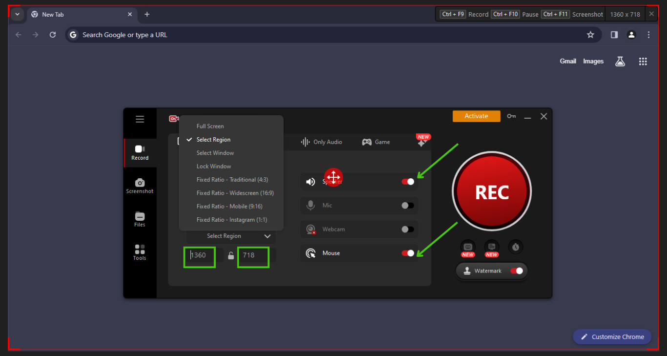 In the record tab, you need to click the right side little drop-down arrow to select your preferred recording area with customizing width and height.