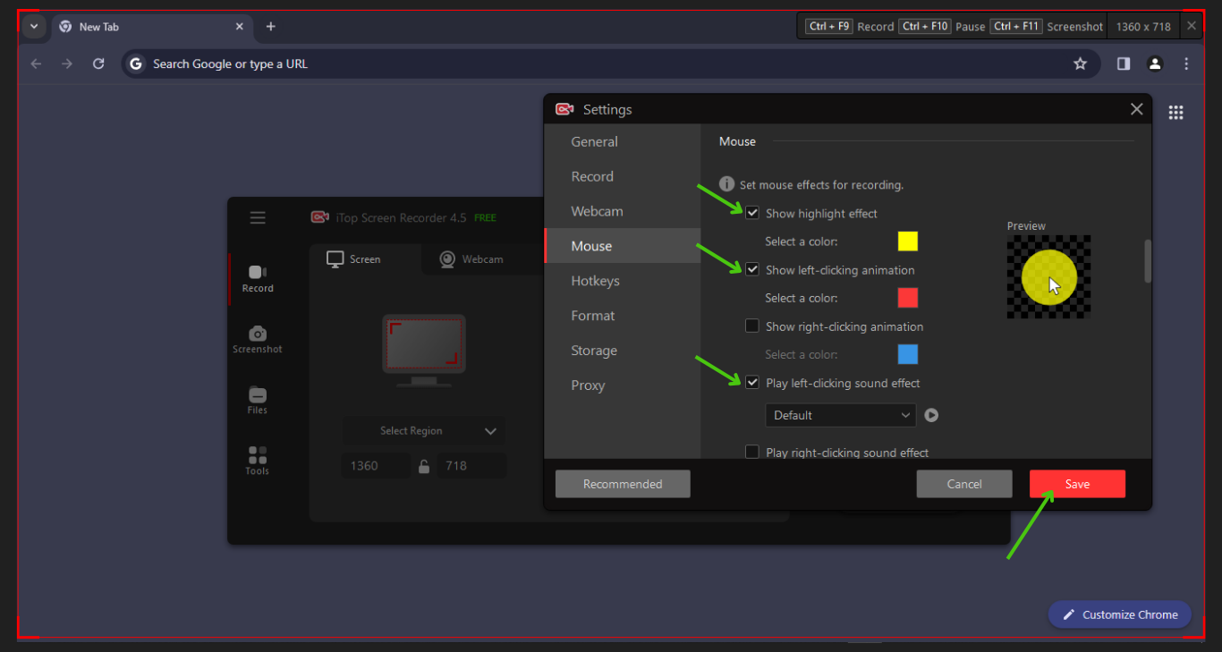 Now, click on the “Mouse” option and its right-side little gear icon to set up some effects (if you want to record your mouse clicks)